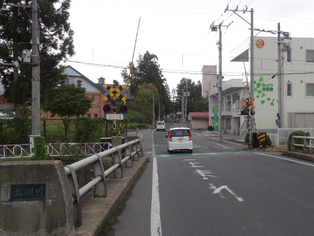 She then walks to the nearby train crossing. You can see the brick brewhouse in the background and a dog statue on the left in the anime shot.